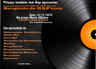 Lança em Pituaçu o surgimento do RAP baiano. Portanto, os residentes de Pituaçu ou região não podem deixar de perder o lançamento do disco do rapper MC Daka, entítulado de “O Surgimento do RAP’ente”.