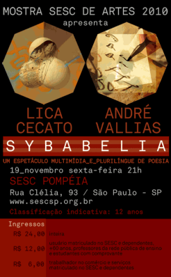 Sybabelia, um espetáculo multimídia e plurilíngue de poesia – com Lica Cecato e André Vallias – será apresentado no teatro do SESC Pompéia, Mostra SESC de Artes 2010, em 19/11, sexta-feira, às 21h