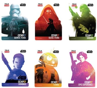 Finalmente um dos objetos mais desejados da maior Comic Con do planeta com um recorde de 196 mil pessoas em 2016, apresentou nesta sexta-feira (4), em parceria da Rede Telecine, as credenciais da quarta edição do evento, e as artes levam alguns personagens mais icônicos da saga Star Wars, como Stormtrooper (quinta-feira), Kylo Ren (sexta-feira), Chewbacca (sábado), Rey (domingo), BB-8 (quatro dias), Darth Vader (Full Experience) e Princesa Leia (Epic Experience).