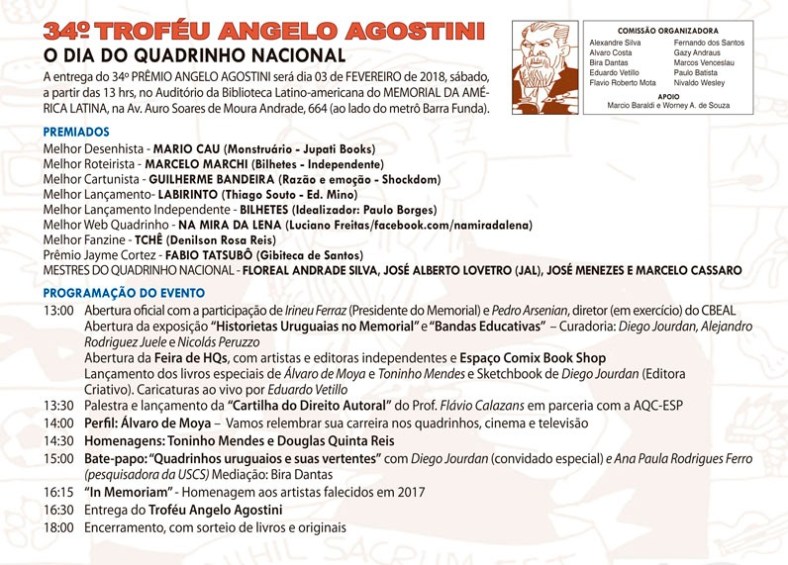 No próximo fim de semana acontece o 34º Troféu Angelo Agostini, no sábado (3), organizado pela AQC-ESP – Associação dos Quadrinistas e Caricaturistas do Estado de São Paulo, será realizado no Auditório da Biblioteca Latino-Americana do Memorial da América Latina, premiando os melhores dos quadrinhos nacional de 2017.